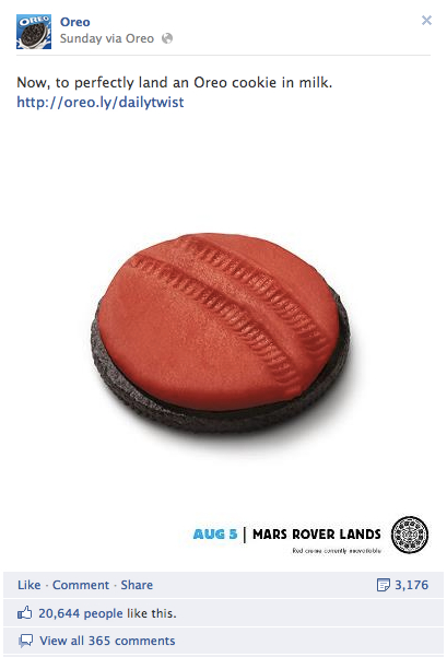 What does an Oreo cookie have to do with the Mars landing? It is part of The Daily Twist marketing campaign – an effort launched by Nabisco-owned Oreo launched in late June to mark the cookie’s 100th birthday. An image of an Oreo will be shared every day for the next 100 days on its Facebook page, a dedicated Tumblr account, and a page on the Nabisco website. This particular image garnered over 20,000 ‘likes’ , 365 comments, and over 3,100 shares on Facebook! Relevant, timely content. That is how you play the social media game! What do you think of their efforts?